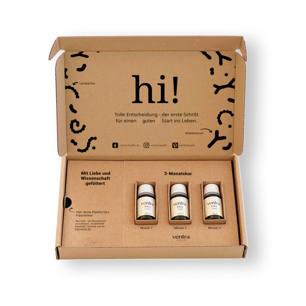 Die Anwendung der Ventra Baby Tropfen erfordert nicht zwingend einen vorherigen Mikrobiomtest. Unsere Tropfen sind so entwickelt, dass sie universell für die Unterstützung der Darmgesundheit von Babys geeignet sind und generell als sicher gelten. Sie zielen darauf ab, eine gesunde Darmflora zu fördern, unabhängig von den spezifischen Ausgangsbedingungen des Mikrobioms deines Babys.